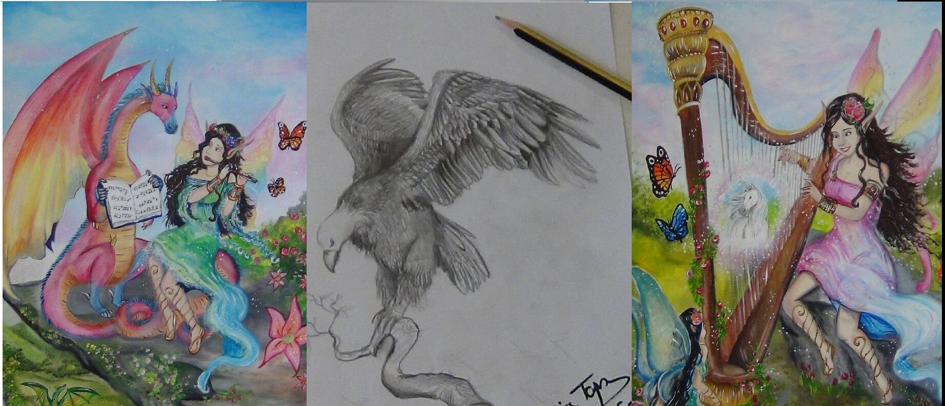 Zo begon het allemaal: het creëren van mijn eigen kleurrijke droomwereld op papier met aquarelverfjes. Later ontdekte ik de tekentablet en mijn potlood evolueerde van puur traditioneel naar een mix van beide werelden.